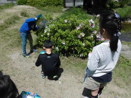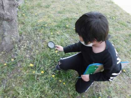 今日は天気がいいので,外に出て生き物を観察しました。中庭やちびっこ広場へ行くと,タンポポが咲いていたりチョウが飛んでいたりしました。じっくり虫眼鏡で観察してから,記録するようにしていました。