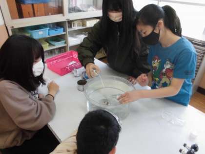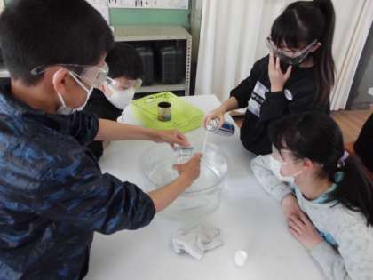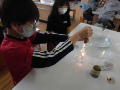 自分たちの周りには,目に見えないけれどいろんな気体があります。今日は,窒素・二酸化炭素・酸素を使って,ものを燃やす働きがあるかどうか調べました。気体がビンの中に溜まっていることが分かるように水の中に一度沈めてから気体を入れていました。その後,ろうそくの火を近づけると,火が大きくなったものがありました。