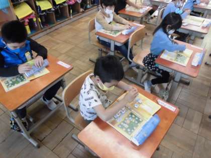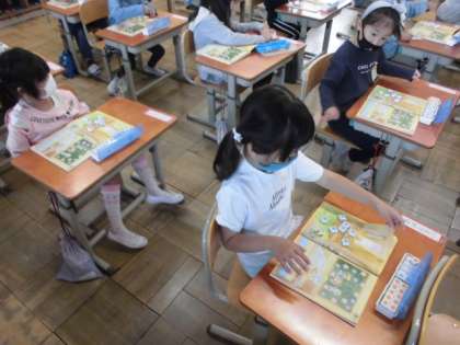 教科書にある絵を見て,いくつあるか数図ブロックを使って数える方法を学習しました。まず,同じ絵の上にブロックを置きます。教科書の上に置いたブロックを机の上に集めてから,きれいに並べます。そして,数えればいいことが分かりました。