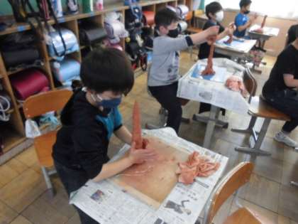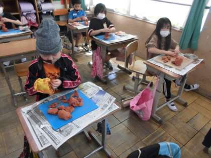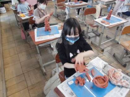 まるめたり,こねたり,ひっつけたりして粘土で形を作りました。粘土が乾いて固まる前に,パーツを作って積み重ねたり,両手で上へ伸ばしてみたりして,できるだけ高くなるように工夫していました。