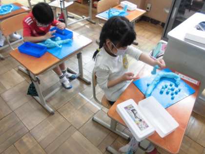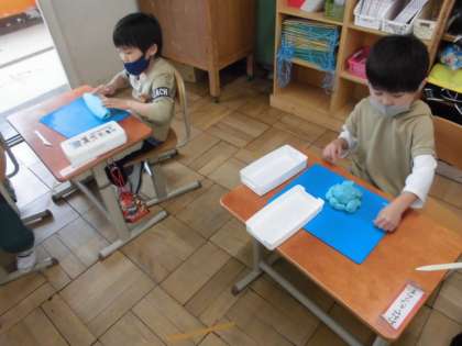 今日は粘土を使っていろんな形を作ってみました。小さなおにぎりをたくさん作ったり細く伸ばして蛇のようにしてみたりと,こねたり丸めたりして楽しんでいました。