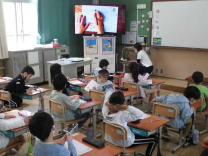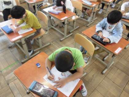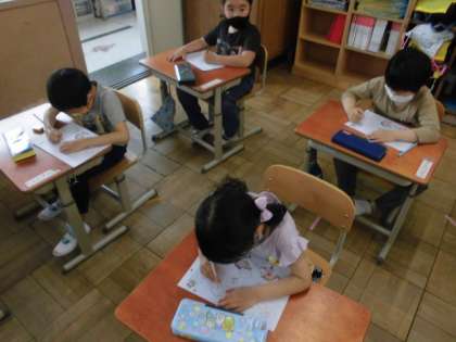 鉛筆を使って線をなぞりました。まっすぐな線もあればくねくね曲がる線,ギザギザの線などいろいろな線をなぞっていきました。はみ出さないように慎重に書いている様子が見られました。