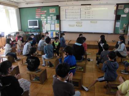 音楽の時間に学習する「友だち」という曲には,四分音符や八分休符などのいろいろな音楽の記号が出てきます。今日は,音の長さに注意して,みんなでリズム打ちをしました。「タン・タン・タン・ウン」や「タン・タ・タ・タン・ウン」などのリズムに合わせて,手拍子をしました。