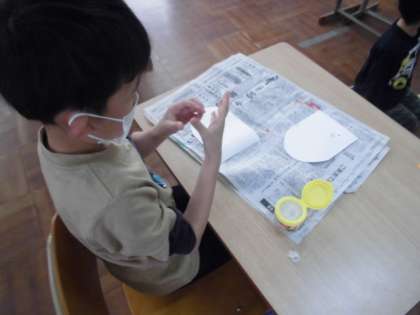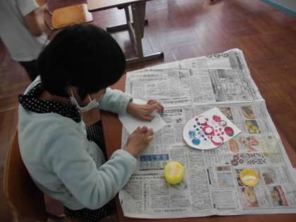 もうすぐ5月5日の子どもの日なので,みんなで「こいのぼり」を作りました。各自渡された画用紙に模様をつけてうろこを作ります。できた人は,裏にのりを塗って貼っていきました。その後,みんながうろこを貼ったこいのぼりに切り込みを入れて,尾びれを作っていました。