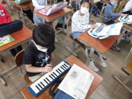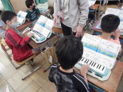音楽の時間には,「かえるのがっしょう」を学習しました。本来なら「ドレミファミレド」と順番に鍵盤を押して演奏するのですが,今日は,指使いだけ確認しました。音が出せないですが,先生のリズムに合わせて上手に指を動かせていました。
