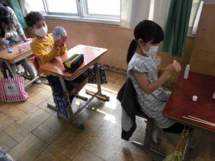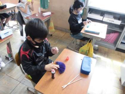 算数の時間には,わりばし2本と色紙3枚を使って,角の大きさがひと目で分かる道具を作りました。色紙と割りばしをセロテープで止めるのですが,ちょうど折った色紙の中心に貼らないといけません。手元がずれたりセロテープが思ったところにつかなかったりして苦労していました。