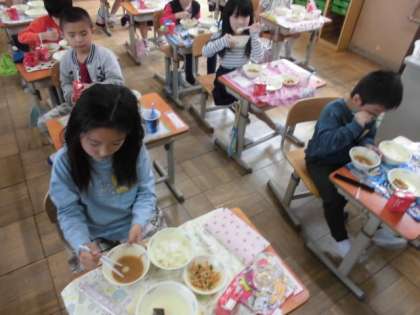 今日の給食は,ごはんやみそ汁など4品もあります。「さば」というお魚も出てきました。カリっと揚げてくれていますが,「骨は大丈夫?」と気にしながら,少しずつ食べている子もいました。