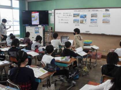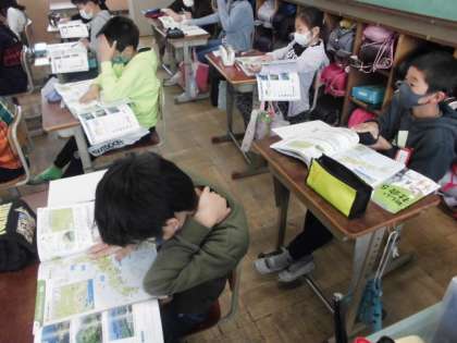 地図帳で日本の国土を見てみると,周りを海で囲まれていること以外にも気づくことがありました。いろんな海岸線があったり火山があったり南北に細長かったりします。色分けされた地形を見ながら,これからどんなことを学習していくか考えました。