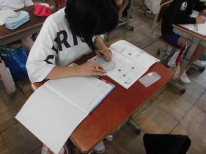 使い方を学習した分度器で角の大きさを測りました。基準となる直線に「0°」を合わせたり頂点に分度器の中心を合わせたりする注意点を確認しながら,丁寧に測っていました。