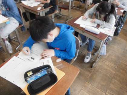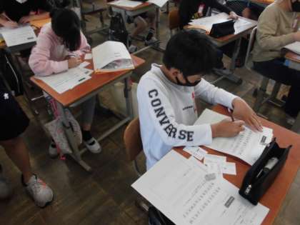 お互いのことを紹介する時に使う自己紹介カードを作り終えた人は,アルファベットの練習に取り組みました。4線が書かれているプリントに大きさに気をつけて書きます。まずは,自分の名前を書きました。大文字の場合と小文字の場合でアルファベットの形が違うので,気をつけて書いていました。