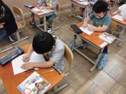 「あさがおのたねはどんな形をしているかな?」という先生の問いかけから,一生懸命にたねを観察し始めました。丸い形や半月の形,長細い形など見る角度によっても全然違うことが分かりました。自分の見た「たね」の形を観察カードに記録し,色も縫っていました。
