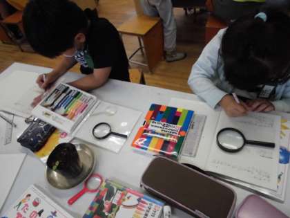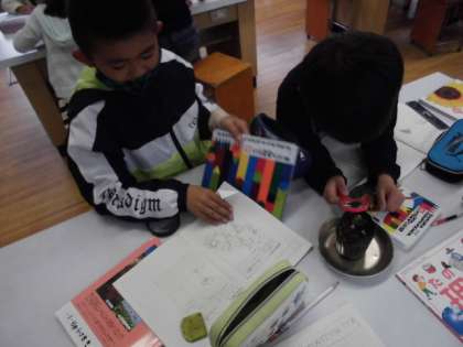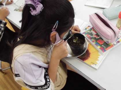 ホウセンカのたねをまいたところ,芽が出てきました。今日は,発芽の様子を観察しました。葉の枚数や形,色,大きさなどいろんなことを観察して記録しました。今はまだ小さな芽ですが,これからどのように育っていくのか楽しみです。