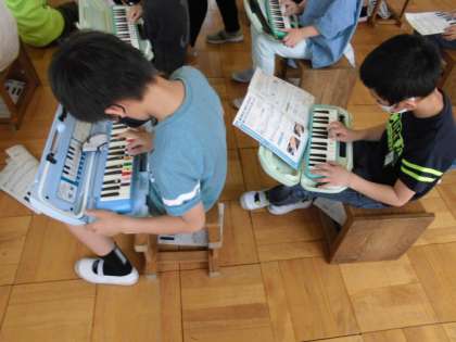 音の高さに気をつけながら,「ドレミで歌おう」という曲を鍵盤ハーモニカで演奏する時の指づかいを学習しました。どの音をどの指で押さえればいいのか確認してから,リズムに合わせて指を動かしていました。