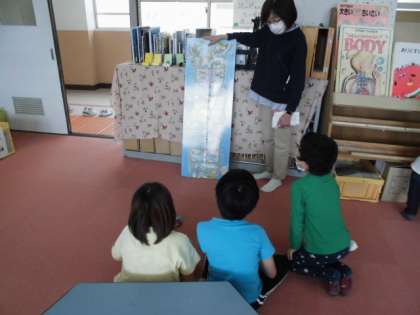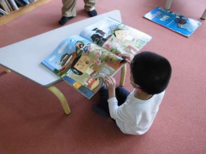 今日は,学校の図書館へ行きました。いろんな絵本がある中,教室にはないような大きな絵本もありました。あまりに大きいので,先生に読んでもらったりがんばってページをめくったりしていました。