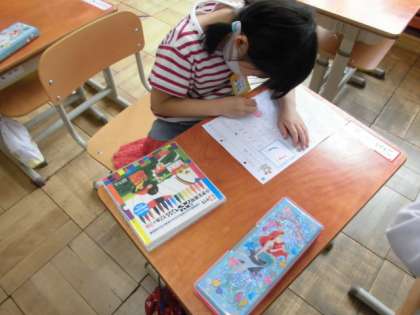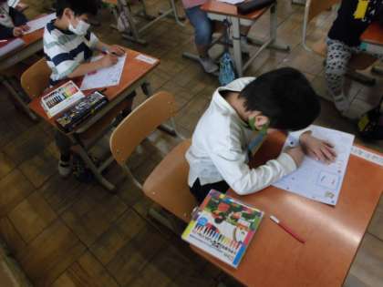 今日,学習するひらがなは「こ」です。いつものように「こ」のつく言葉を探しました。「こくご」「こいのぼり」「こんにゃく」など,たくさんの言葉を知っているようでした。丁寧に書けた人は,挿絵に色を塗っていました。