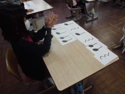 今日の音楽では,これまでに学習した四分音符や八分音符を使って,自分でリズムを作りました。配られた音符を並び替えながら,気に入ったリズムができるように手拍子しながら試していました。