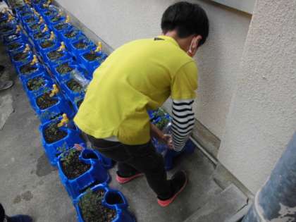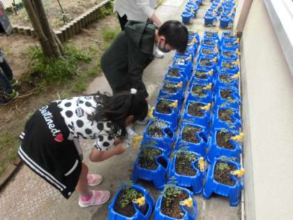 2年生は学校でミニトマトを育てています。毎日の水やりも欠かせません。今日の帰りも自分のトマトに水をあげていました。大切に育ててたくさん実がなるといいですね。