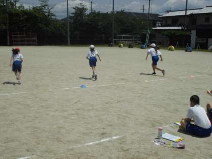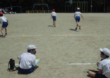 体育の時間には,外で体力テストをしました。今日の種目は「シャトルラン」です。音に合わせて線と線の間を走りながら往復します。回数を重ねると徐々にペースが上がっていきます。息を整えながら自分の記録に挑戦していました。