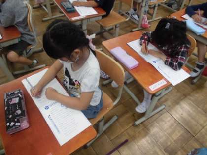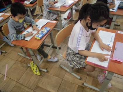 今日,初めて算数のノートを使いました。ノートを開くと,一番上に数字が書いています。まずは,順番に数字を書いてみました。ノートのマスの中に入る大きさで丁寧に書いていました。