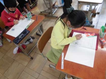 算数の時間には,数え棒を使って繰り下がりのひき算について考えました。21枚ある色紙のうち8枚使うと残りは何枚になるか計算しようと思っても1から8がひけません。そこで10のまとまりを意識して計算するようにしました。