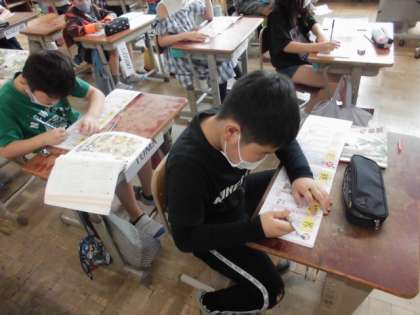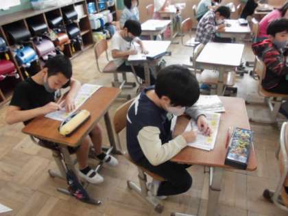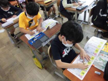 国語の時間に漢字の学習をします。毎日,少しずつ学習しないと一度に覚えきれません。今日は,世界の「界」や親指の「指」など4つの漢字を学習しました。読み方や書き順を確認してから丁寧に書きました。