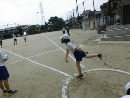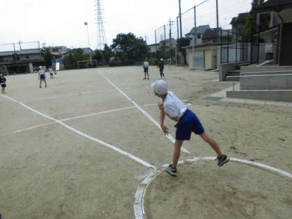今週の天気予報はあまり良くありません。でも,今朝は雨が上がっていたので,急いで準備して運動場でソフトボール投げをしました。小さな円から出ないように気をつけながら遠くに投げていました。