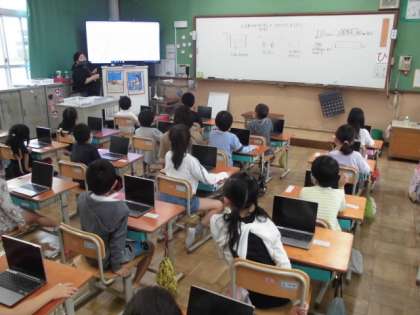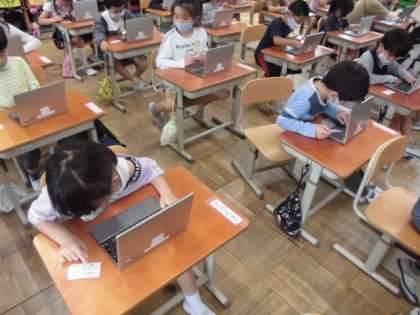 今年度より1人1台のタブレット端末が導入されました。1年生も早く使えるようになるために,今日は使い方のルールを学習しました。落とすと壊れてしまうので,机の真ん中に置くことや両手で持つことなど大切に扱う方法を知りました。自分のパスワードを教えてもらったので,キーボードを押して入力する練習もしました。