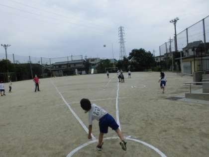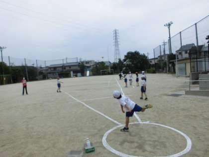 体力テストの種目にある「ソフトボール投げ」をしました。小さな円の中から思い切って遠くに投げます。どちらの足を前に出して投げるのか迷っている子もいましたが,斜め上へ向かって投げようとしていました。