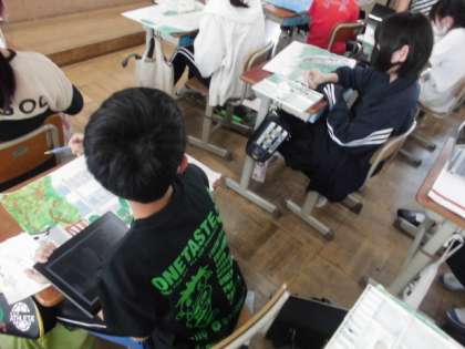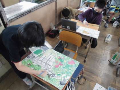 図工では,自分の気に入った風景を絵に表しています。下描きも終わり,絵の具で着色しています。なかなか思った通りの色にならないようですが,塗り方を工夫しながら,自分のイメージに合うようにがんばっています。緑でもいろんな緑があるので,微妙なちがいにこだわっていました。