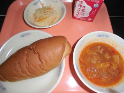 ふっくらとした手作りのミートボールと,やわらかく甘みのある春キャベツがトマト味とよく合う献立です。