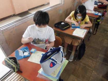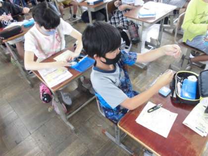 家庭科の時間には,裁縫セットを使って「玉結び」のやり方を学習しました。針に糸を通してから糸が抜けないように指を使って結び目を作ります。1度聞いただけでは分かりにくいので,何度も動画を見ながら確認していました。