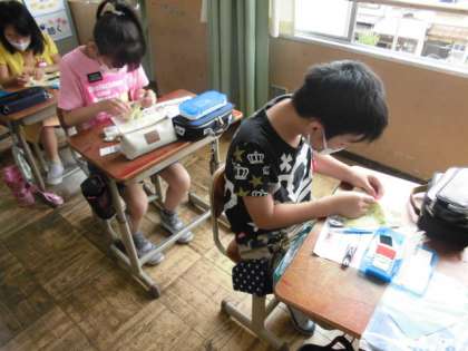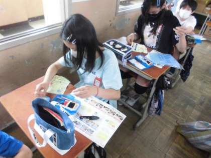 今日の家庭科では,名前の縫い取りとボタン付けに挑戦しました。前に学習した玉結びをして糸が抜けないようにしてからカタカナでぬっていきました。できた人は穴の数が違う3つのボタンを縫い付けました。テレビに流れている映像を参考にしながら,集中して縫っていました。