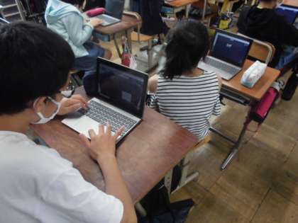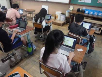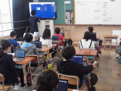 今日はタブレットでロイロノートを使ってみました。自分で撮った写真に加工を加えてからシステム上で提出しました。みんなの撮った写真が集まったので,次は先生から自己紹介カードが送られてきました。自分の画面に届いた時,みんな驚いていました。
