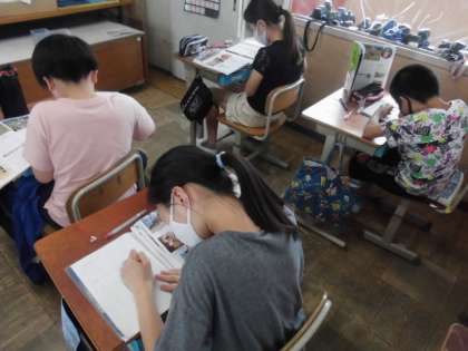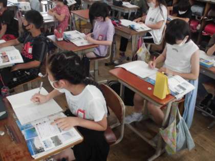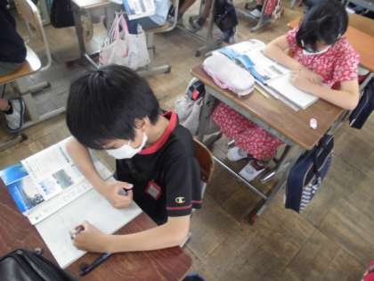 社会の時間には,教科書や資料を使って,沖縄の様子を調べました。伝統文化や自然,農産物に分かれて,シーサー,パイナップル,サンゴなど沖縄ならではのことについて調べ,ノートにまとめていました。