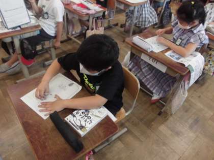 図工の時間には,「海や川」というテーマで,デコボコを生かすデザインを考えました。自分の描きたいものをはみ出すぐらい大きく描くようにレイアウトも考えました。イカやタコ,クラゲなど自分で選んだ生き物を描いていました。