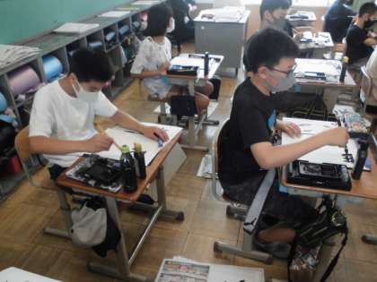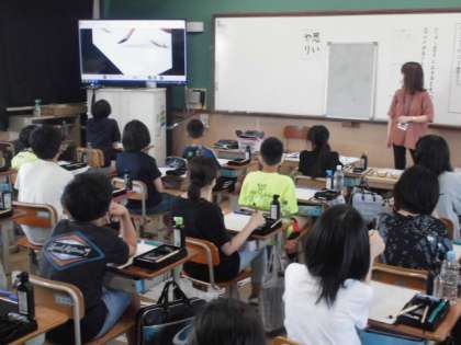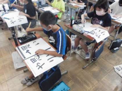 書写の時間には「思いやり」という字を書きました。文字の配列や大きさ,つながりを意識して書くためにポイントを動画で確認しました。細い線や斜めの線を書くために筆の入れ方を気にしながら書くようにしていました。
