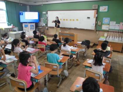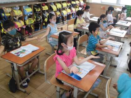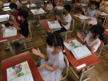 音楽の時間には,「たん たん たん うん」というように手でリズム打ちをしました。リズムが合ってくると,「かたつむり」の曲に合わせて手をたたきました。早くみんなと歌ってみたいです。
