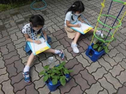 毎日,水やりしているので,あさがおもすくすく成長してきました。つるがずいぶん伸びてきたあさがおには,支柱を立てるようにしています。つるが伸びたり葉の数が増えたりしている様子から,自分が育てているあさがおが大きくなっていることに気づいていました。