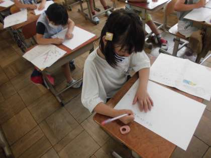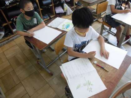 ミニトマトの成長の様子を丁寧に観察してきました。その様子を絵と文で表すようにしています。どんな絵を描けばいいか,様子がよく分かるように伝える文はどんな文なのか考えながら書くようにしていました。できるだけ習った漢字も使うようにしていました。