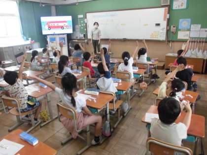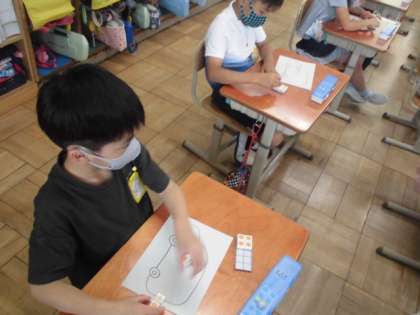 バスには,乗ってくる人や降りる人がいます。乗ってくると人の数が増え,降りると減ります。その様子を数図ブロックを使って表しました。人が降りる時はブロックを取る操作をすることでひき算につなげていきたいです。