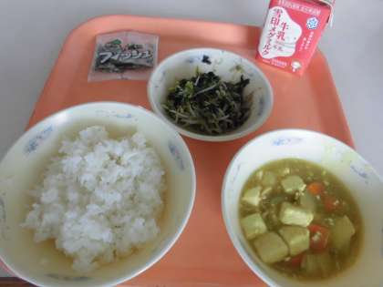 子供たちから,「『和風カレーどうふ』は,少しカレー味でピリッとからく,とうふのふわっとした感じが,おいしかったです。『ほうれん草ともやしのごま煮』は,もやしがシャキシャキでおいしかったです。」と,感想をくれました。