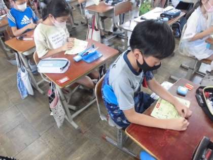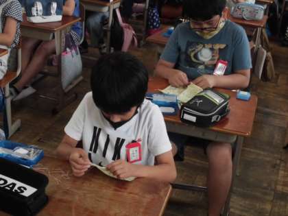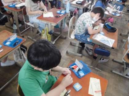 今日の家庭科では,かがりぬいのやり方を学習しました。玉結びにはずいぶん慣れてきたようで,それぞれに玉結びをしてから,指定された場所へ布の裏から針をさします。上に出てきた針を布の外側を通りながらまた裏から針を通します。その繰り返しだと分かると,どんどん縫い進めていました。