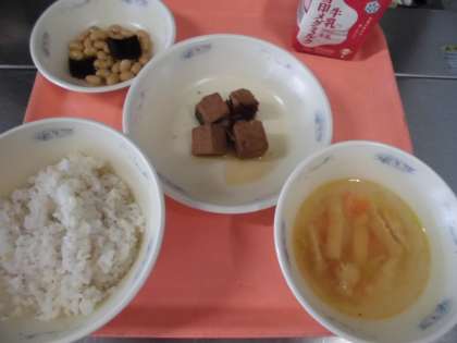子供たちから,「『なま節のしょうが煮』は,ごはんと食べると味がちょうどよくとっても美味しかったです。『すまし汁』は,油揚げに味がしみこんでいて,キャベツも入っていて,おいしかったです。」と,感想をくれました。