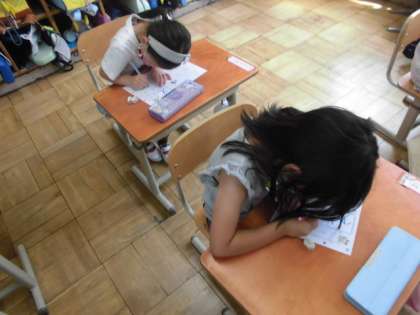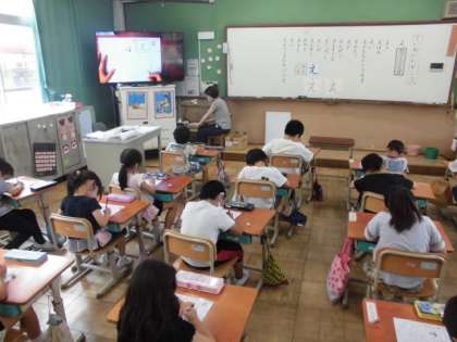 今日のひらがなは「え」です。2画目が難しいので,みんなでどんなことに気をつけて書けばいいか出し合いました。「えほん」「えんぴつ」「えのぐ」というように「え」のつく言葉もたくさんありました。