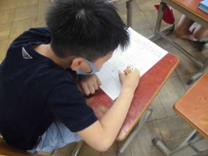校区内にはどんなものがあるか探検しました。前回とコースが違うので,新たな発見がありました。学校に戻ってから見つけたものを絵と言葉で書いていました。