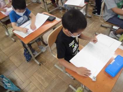 国語では「くちばし」という教材で学習しています。今日は,教科書の文をお手本にして考えた「いきものくいず」を清書しました。自分が選んだ生き物はどんな体をしているのか紹介するように「これはなんの〜でしょう。」というくいずを作っていました。