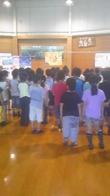 昨夜のキャンプファイヤーの様子の映像が送られてきましたが,暗くて映像がはっきりしないのでアップしませんでした。今朝の朝の集いの様子です。全員元気です。ご安心ください。
