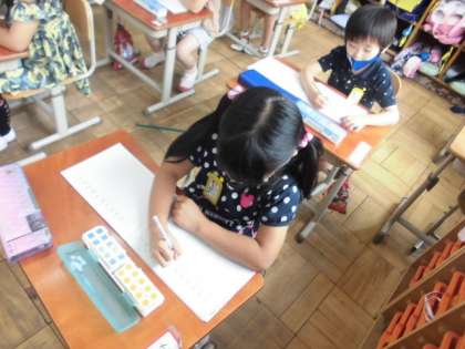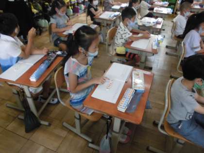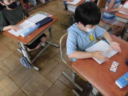 かえるが4匹いるところへ2匹やってくると何匹になるのか考えました。すぐに式に表して計算するのではなく,まずは,数図ブロックに置き換えて,お話の通りに合わせてみました。操作活動を通して,たしざんの仕組みを理解していました。
