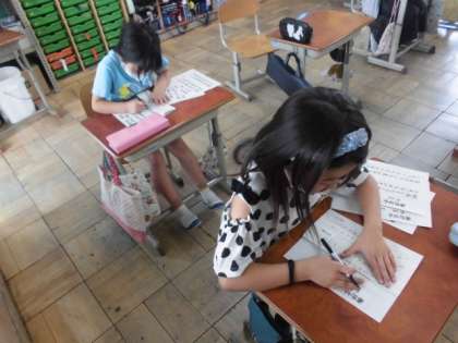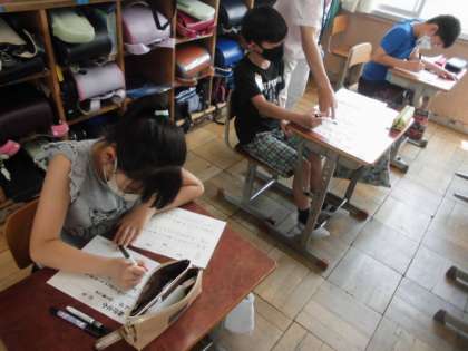 今日の書写の時間には,マイネームで文字の形に気をつけて,バランスの良い字を書きました。毛筆とは違って,普段から使っているペンなので,扱いには慣れています。しかし,きれいな字を丁寧に書くとなるといつもと勝手が違います。納得のいく字が書けるまで,何度も挑戦していました。