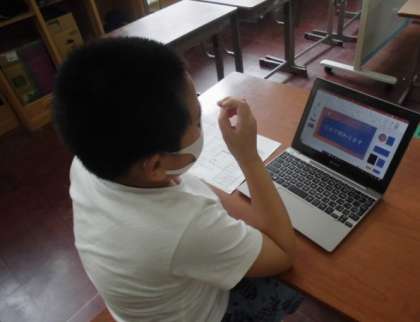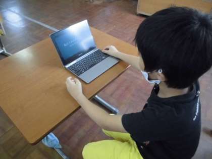 学校の「すてき」をみんなに紹介するためにプレゼンを作っています。写真を撮ってスライドに貼り付けたり文字を入力したりしました。全体が見えてくると,何度か動かしてみて順番や文字の大きさなどを確認していました。